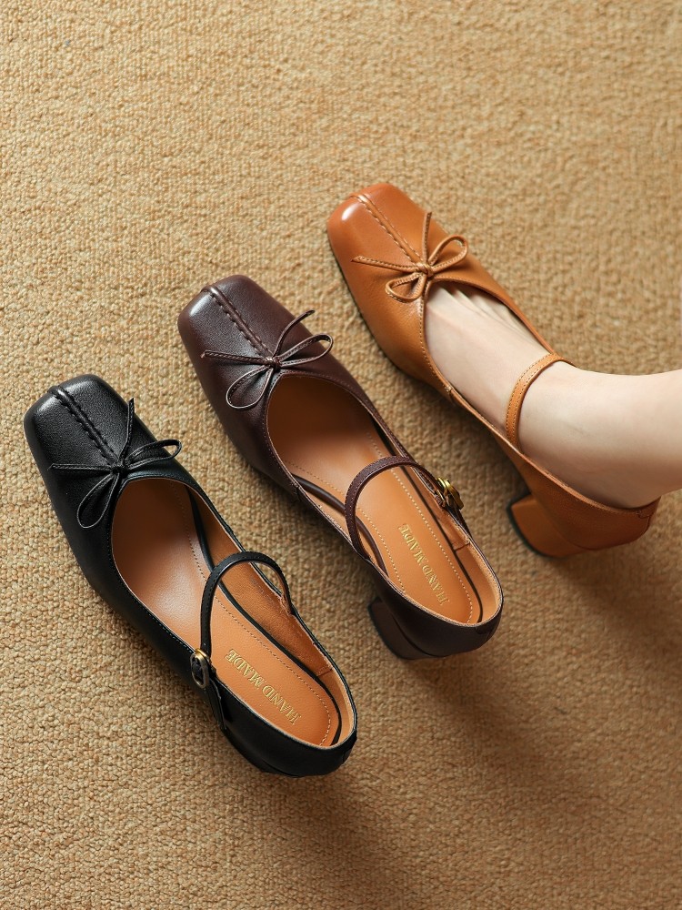 全真皮牛皮复古蝴蝶结玛丽珍鞋女鞋子粗跟2025夏新中跟小皮鞋单鞋