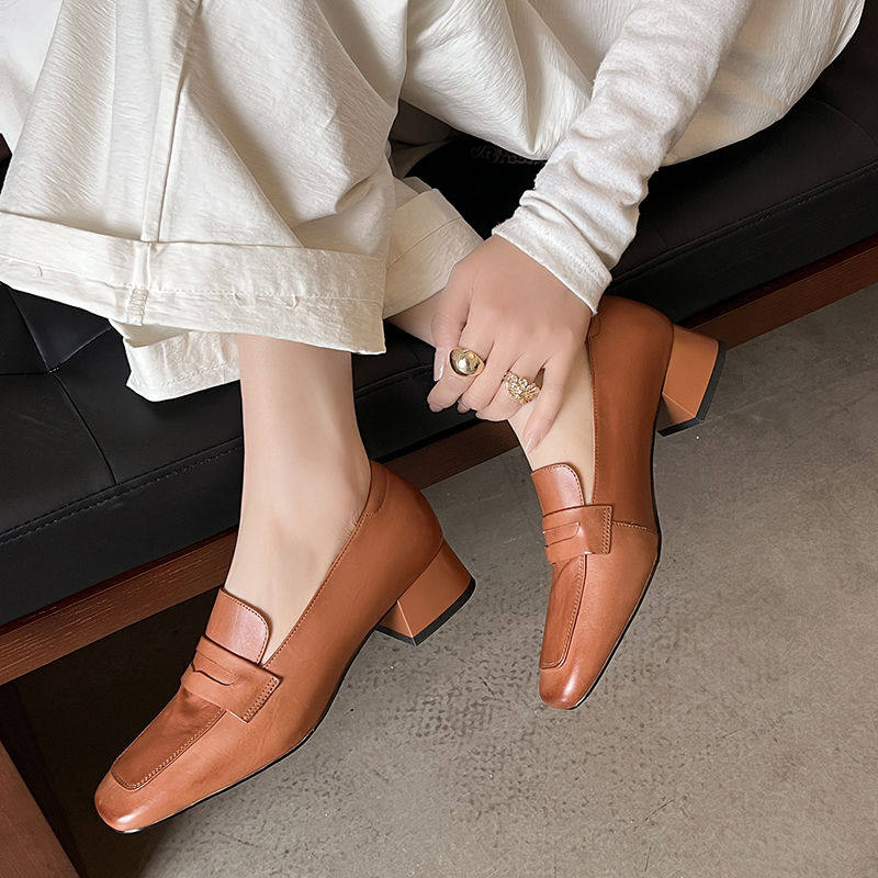 牛皮/3.5cm真皮单鞋女新款粗跟中跟乐福鞋复古一脚蹬百搭小皮鞋春