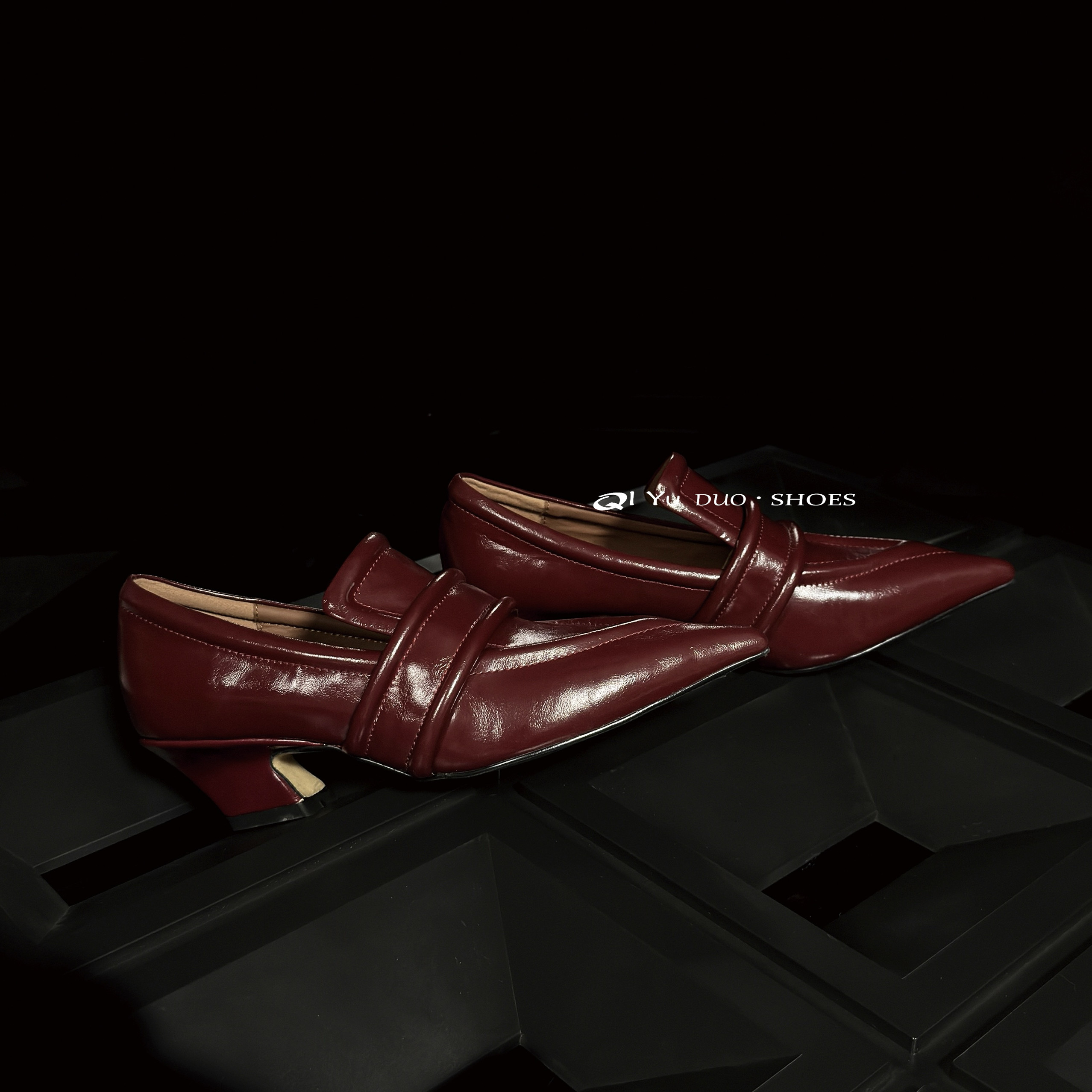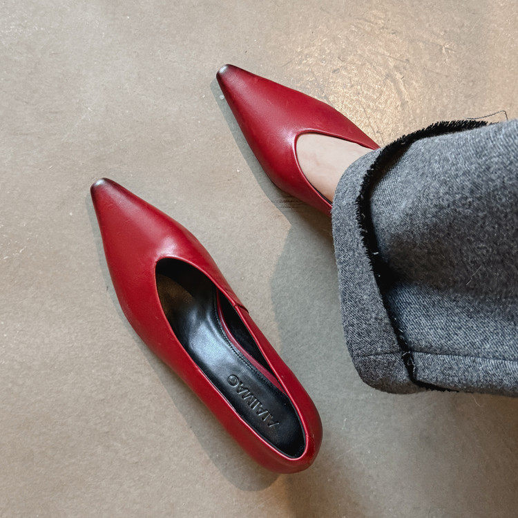 复古真皮牛皮风尖头深口单鞋女中跟粗跟红色高级感时尚气质小皮鞋