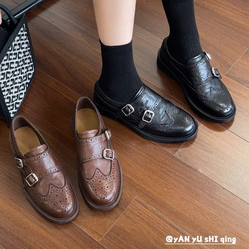 美拉舒适牛皮真皮布洛克鞋单鞋女2025秋新款英伦风中跟小皮鞋女鞋