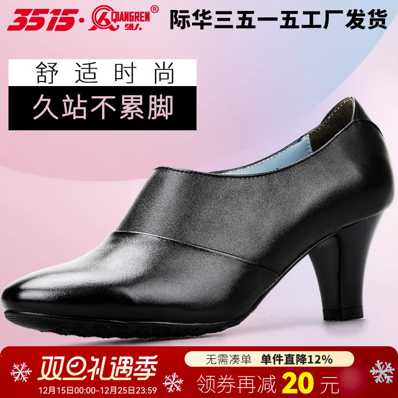 强人3515真皮皮鞋女黑色工装鞋中跟职业公务员通勤牛皮单鞋女鞋子