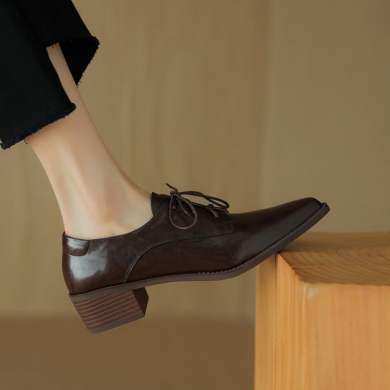 复古尖头真皮牛皮中跟小皮鞋女春秋新款百搭舒适粗跟系带深口单鞋