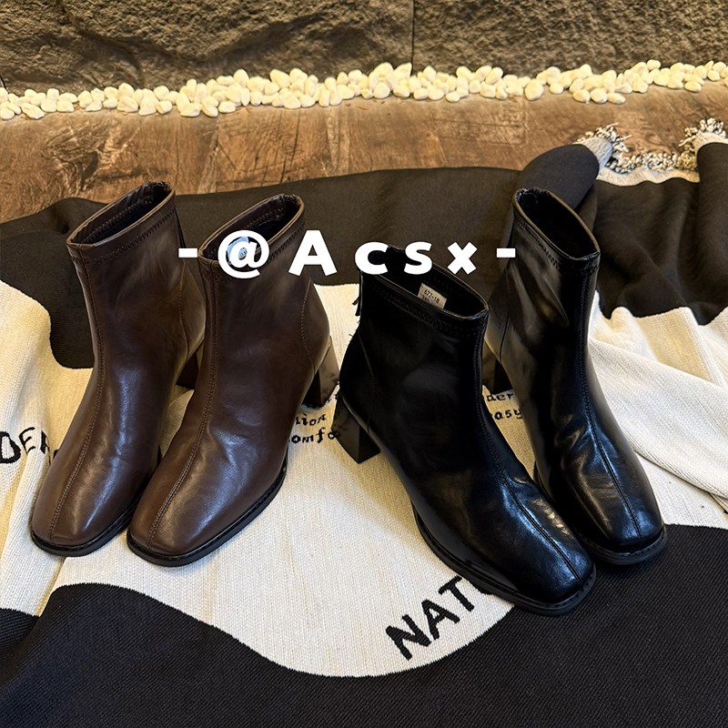 复古方头小羊皮中跟粗跟瘦瘦短靴女秋冬季新款瘦瘦靴后拉链马丁靴