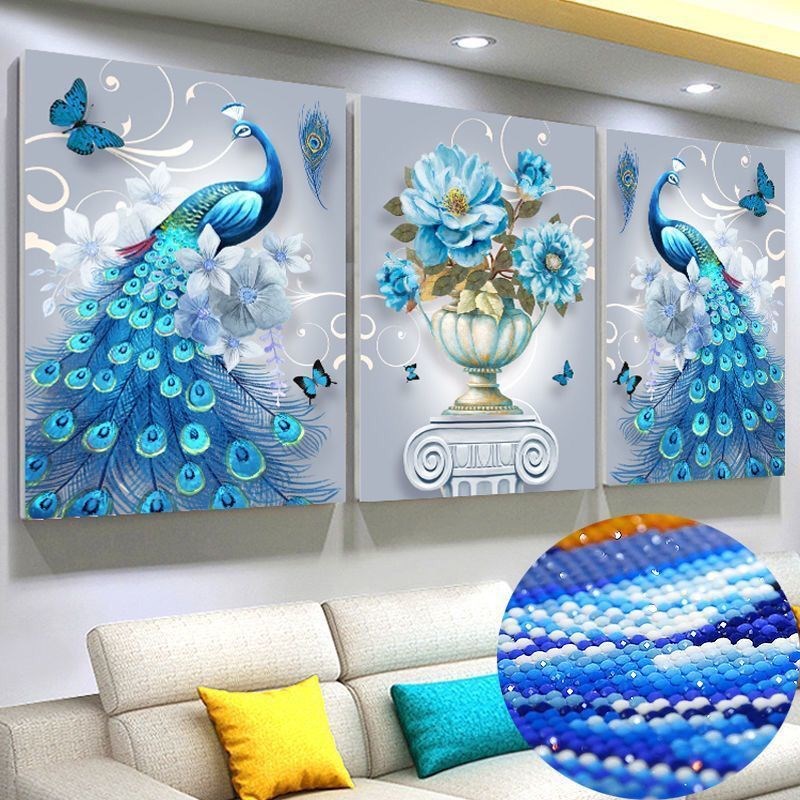 欧式5D钻石画满钻客厅孔雀花卉三联画点贴钻十字绣钻石绣2019新款