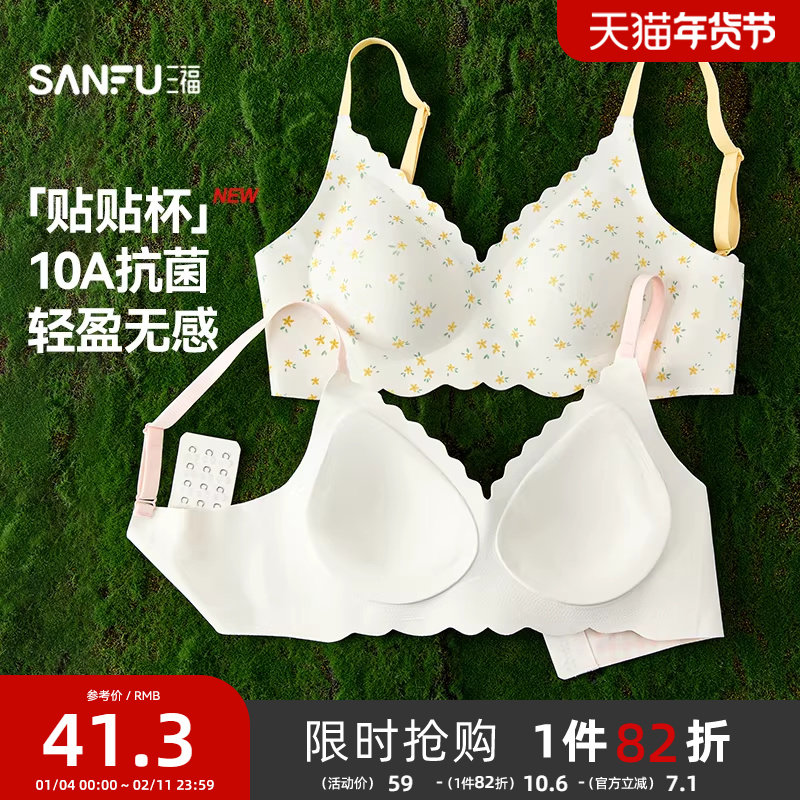 三福薄杯无钢圈聚拢收副乳文胸舒适透气水滴形模杯无感波点内衣女