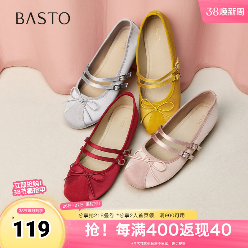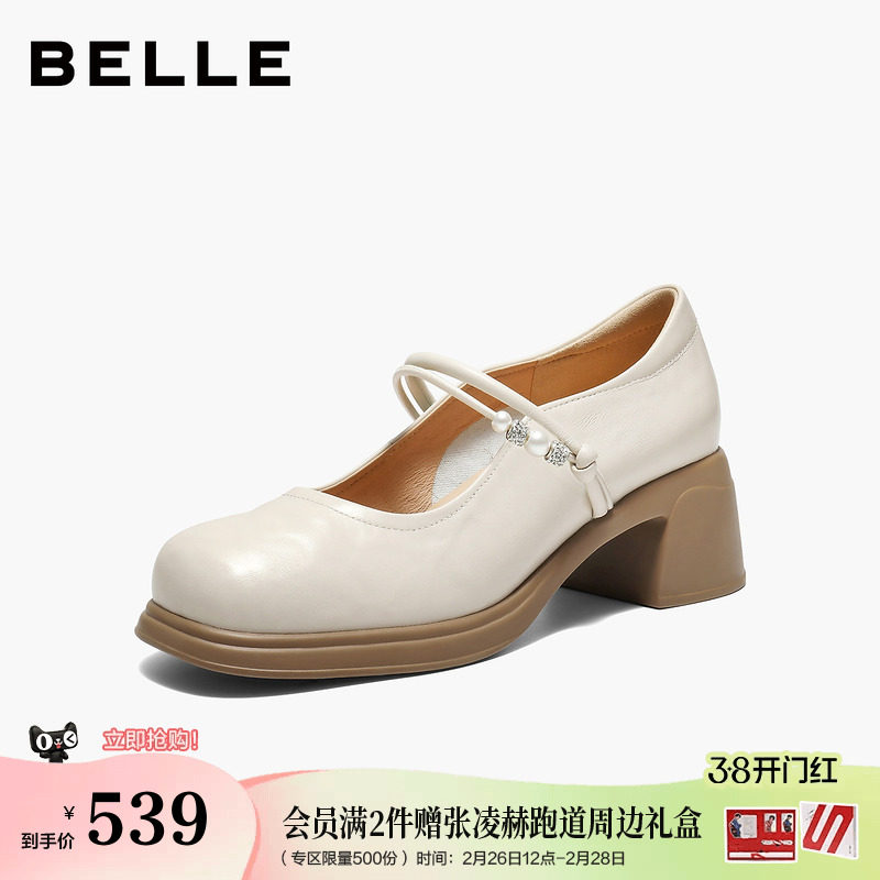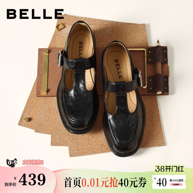 百丽粗跟玛丽珍鞋子女26春季新款复古真皮小皮鞋浅口单鞋3A6C2AQ6