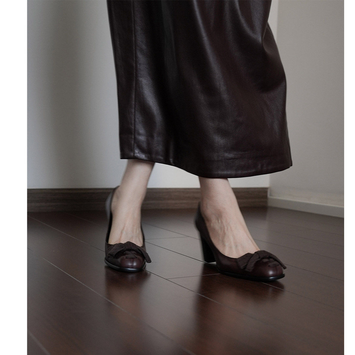牛皮版~法式复古浅口单鞋女粗跟通勤风方头高跟鞋简约蝴蝶结女鞋