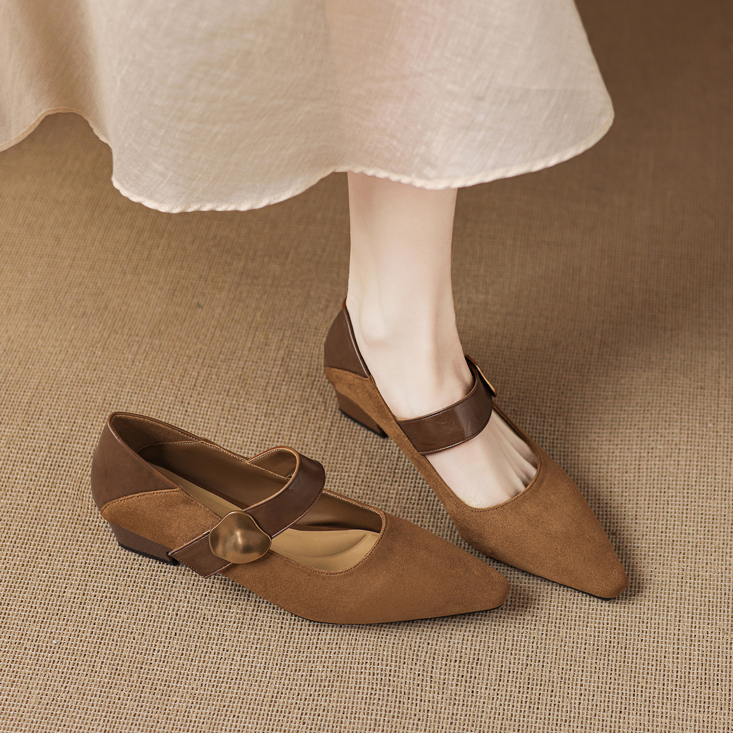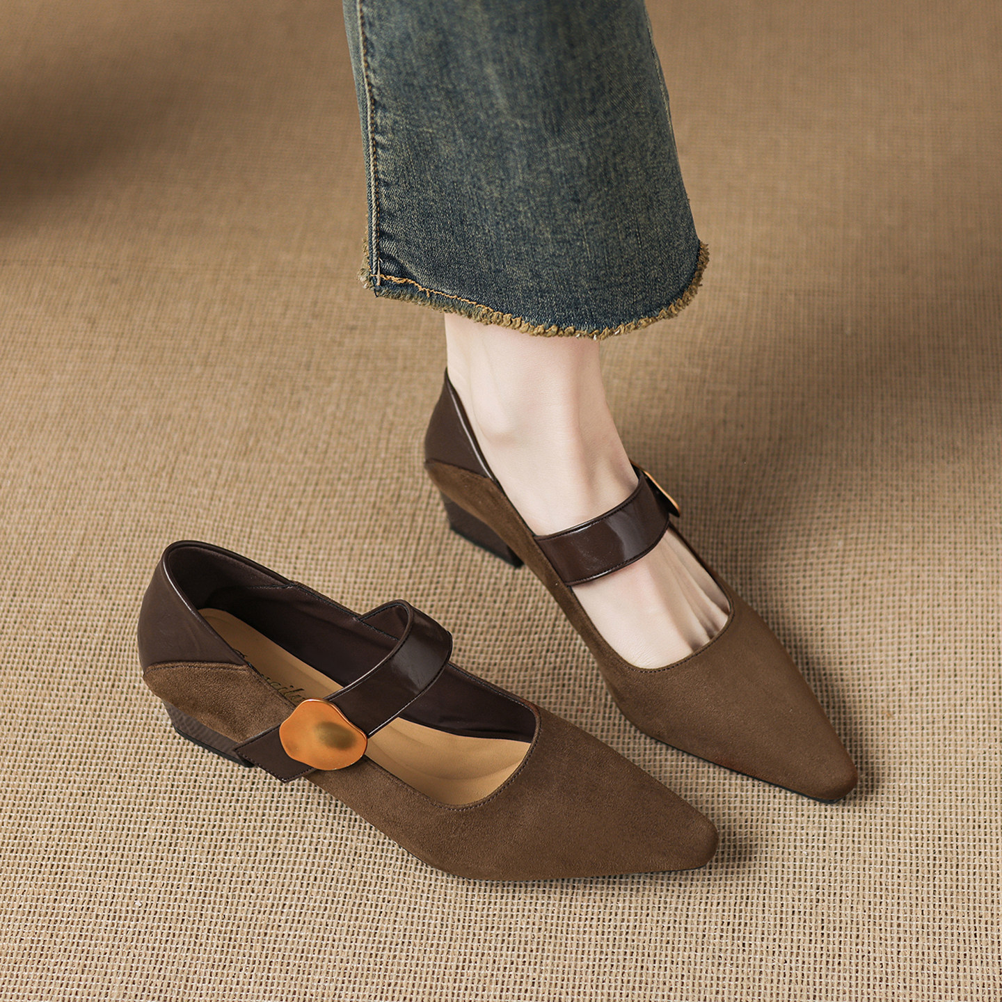 羊皮版sanjuan三卷复古棕色玛丽珍鞋女粗跟浅口方头单鞋春高跟鞋