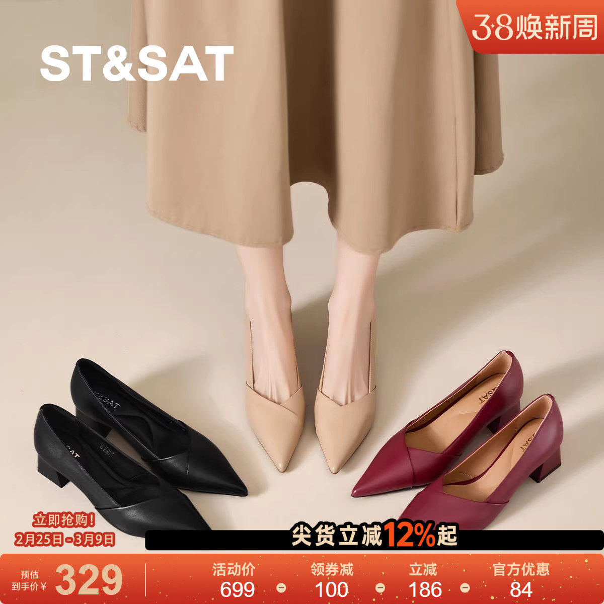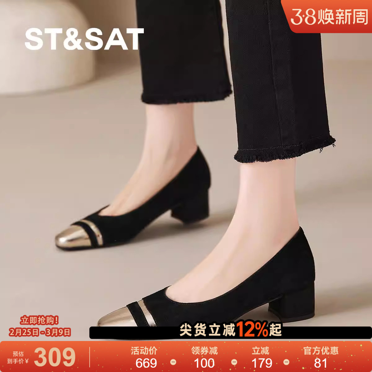 星期六复古尖头高跟浅口单鞋女秋季新款不累脚粗跟工作通勤小皮鞋
