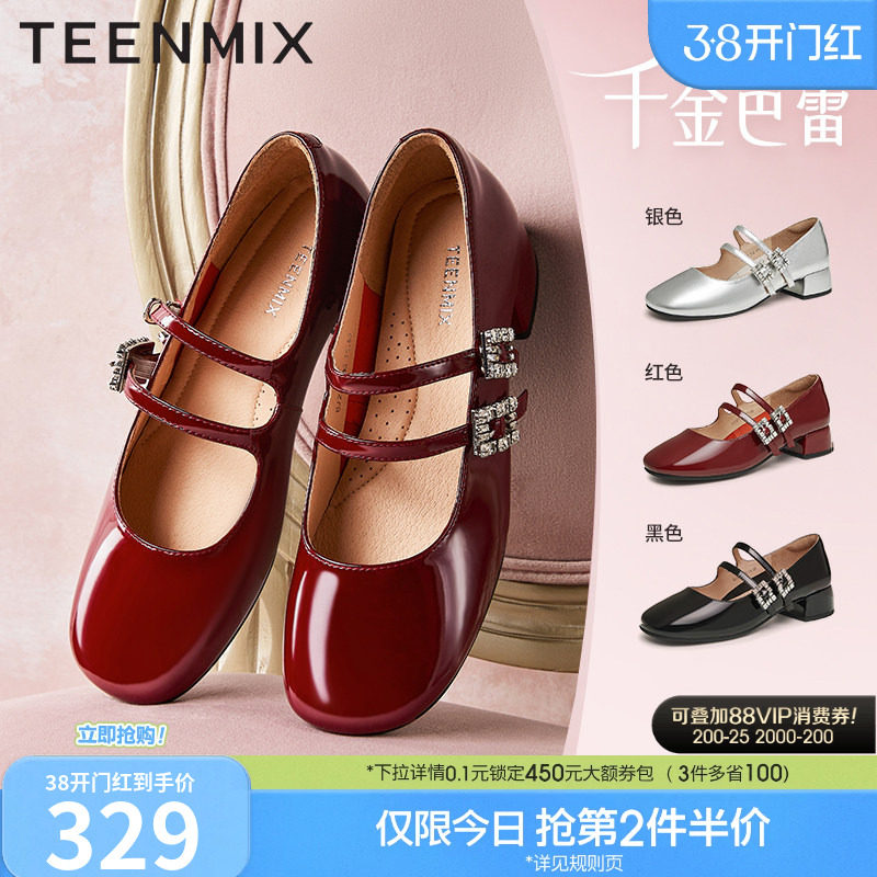 天美意千金芭蕾复古红色玛丽珍小皮鞋高跟鞋女鞋新款粗跟浅口单鞋