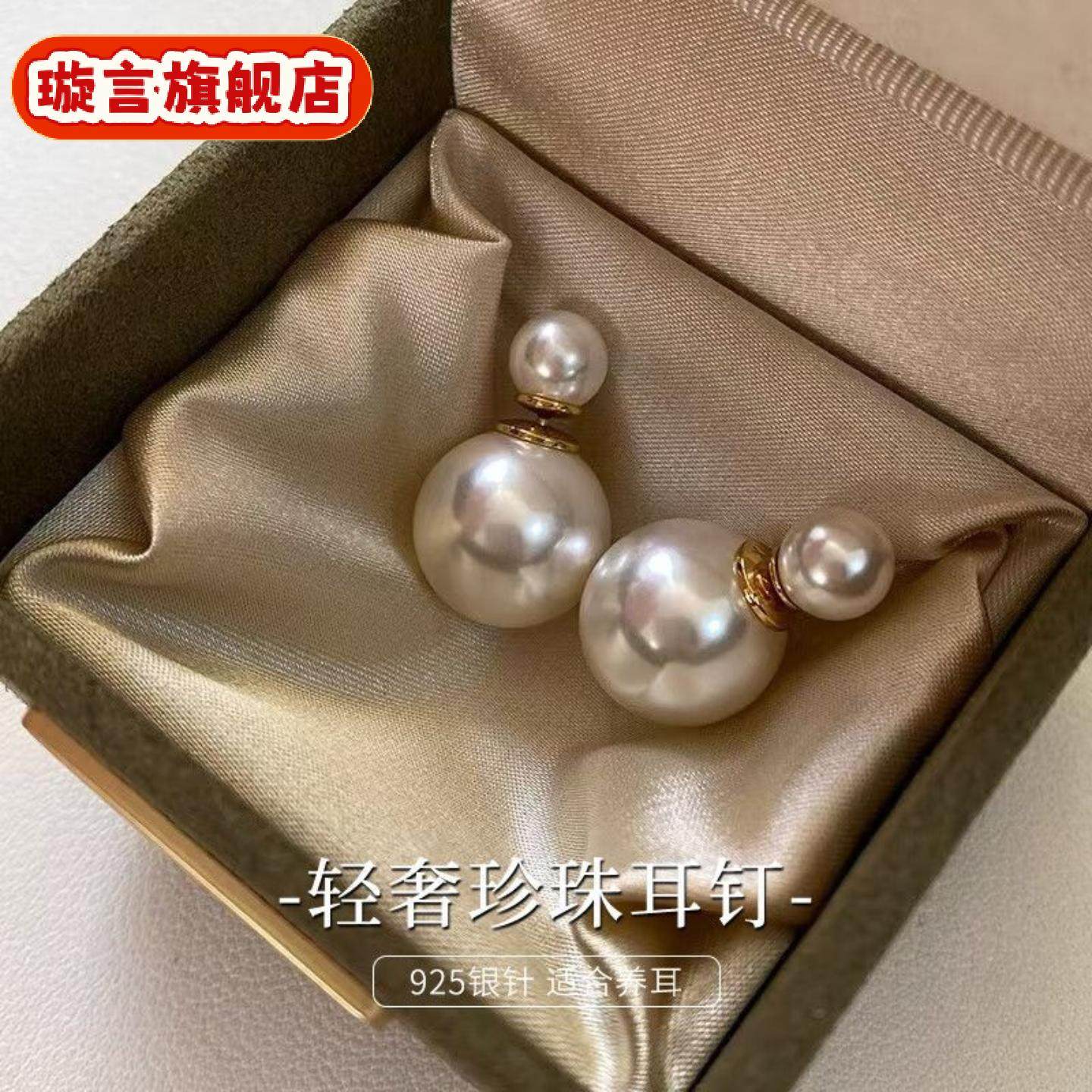 925纯银双面珍珠耳钉女气质百搭耳饰网红前后两戴大小耳环高级感