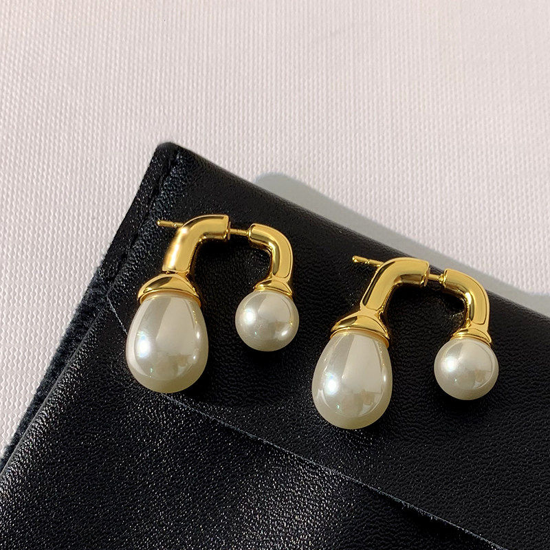 韦雪同款双面珍珠耳环女复古高级感轻奢气质耳钉金色字母吊坠耳饰