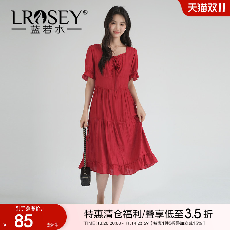 蓝若水大码女装2025夏新款胖MM红色连衣裙高腰方领气质减龄中长裙