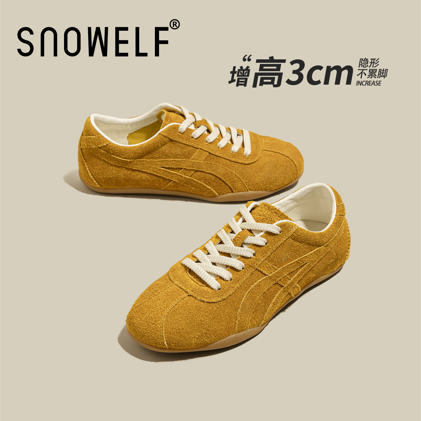 真皮复古德训鞋女款2026新款黄色鞋子小个子百搭女鞋内增高运动鞋