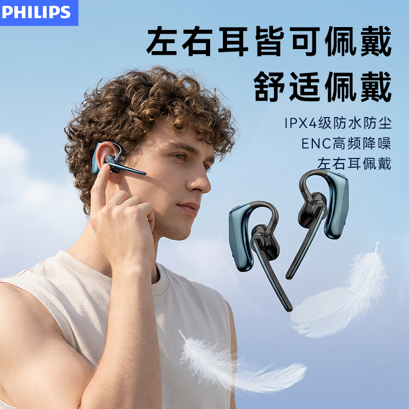 飞利浦单耳挂耳式无线蓝牙耳机带麦克风商务会议开车通话手机通用