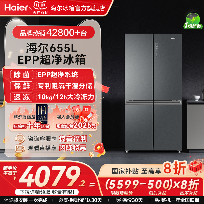 海尔冰箱以旧换新补贴655L十字双开门一级风冷冰箱家用大容量官方