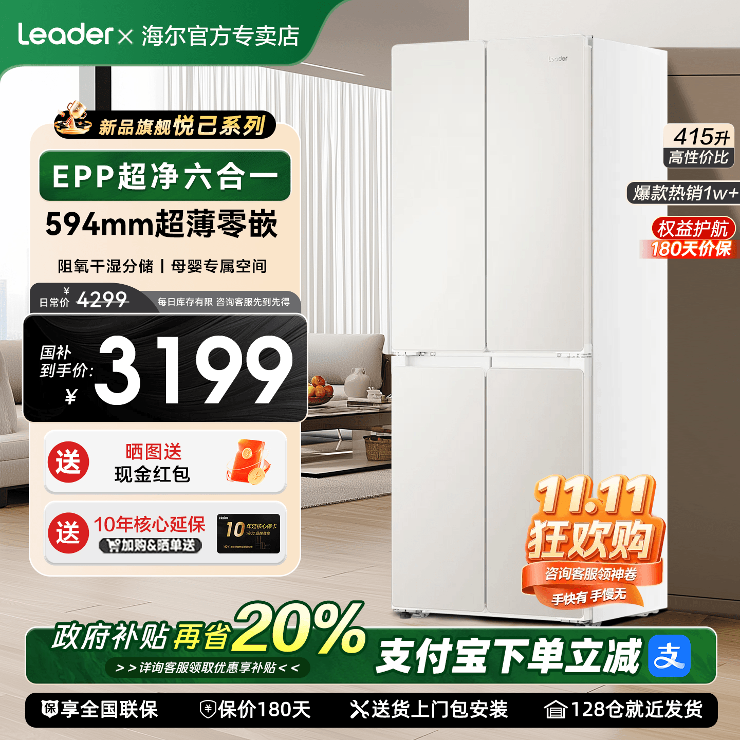 国补20%】统帅海尔出品超薄十字对开门一级能效家用415升风冷冰箱