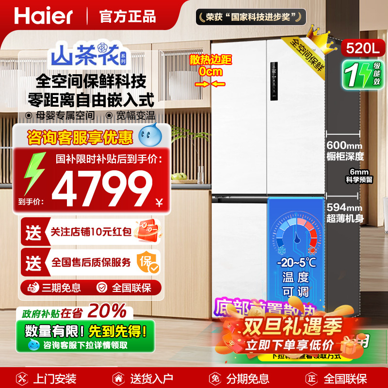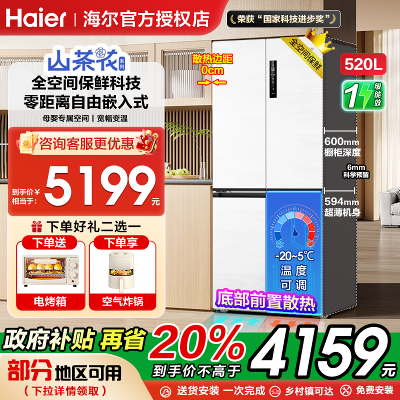 换新补贴海尔山茶花520L双开四门一级超薄零嵌入式家用风冷冰箱