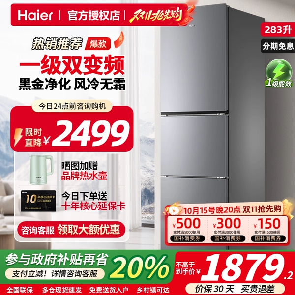 海尔电冰箱283左右三开门一级变频节能家用风冷冰箱官方旗舰正品