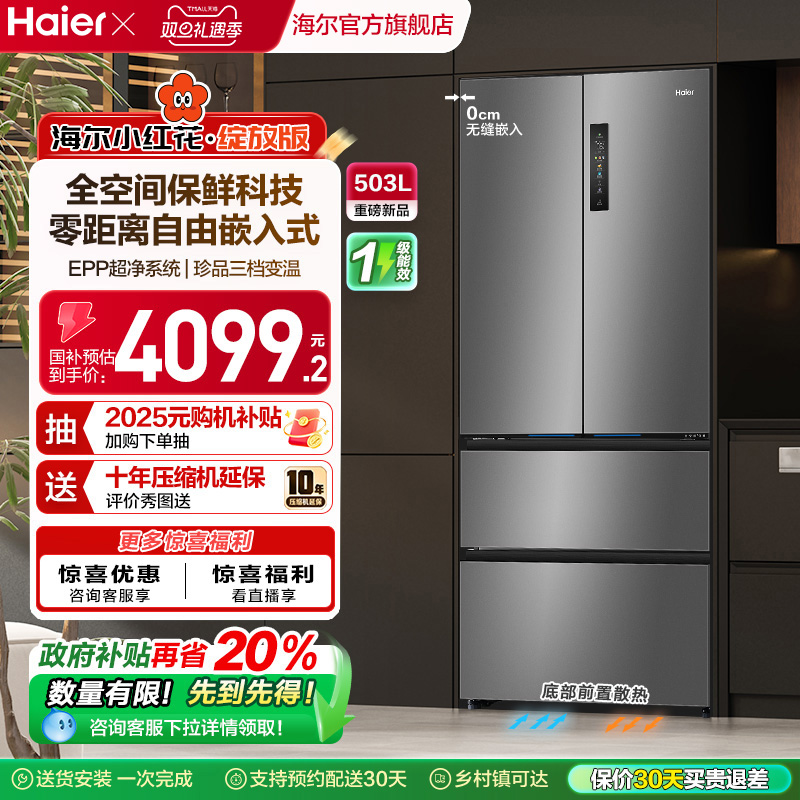 换新补贴海尔小红花503L法式四门一级超薄零嵌入式家用风冷冰箱