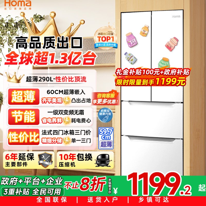 奥马冰箱一级能效家用变频无霜嵌入式小户型节能法式风冷冰箱超薄