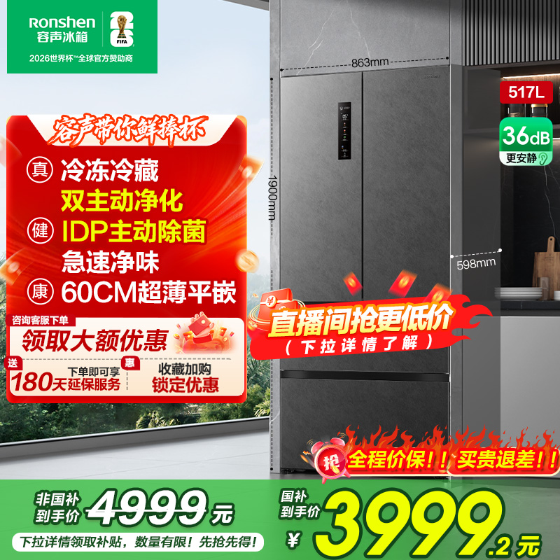 容声517WD2MPQLA法式四门超薄零嵌IDP双净一级节能变频风冷冰箱