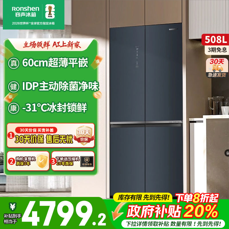 容声508WKK1FPCQA十字四门超薄零嵌入IDP除菌风冷冰箱门店同款