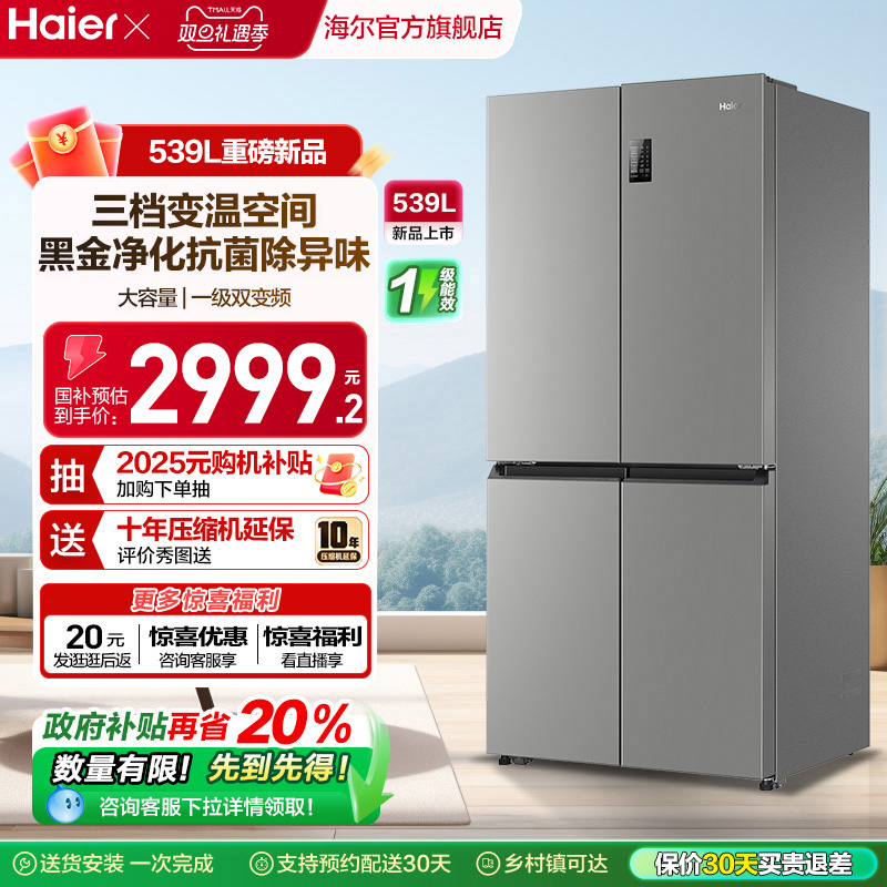 海尔冰箱以旧换新补贴531L十字双开门一级风冷冰箱家用大容量官方