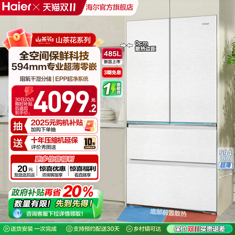 政府换新补贴海尔山茶花485L零嵌入式法式一级大容量风冷无霜冰箱