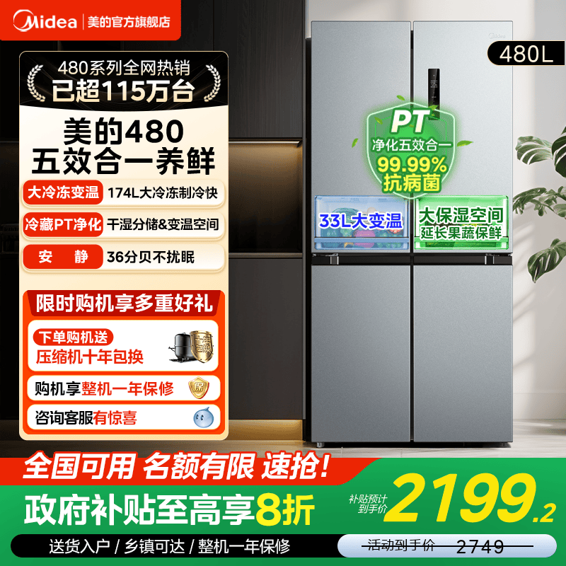 美的480L十字双开四门大容量一级风冷无霜薄嵌入家用冰箱换新补贴