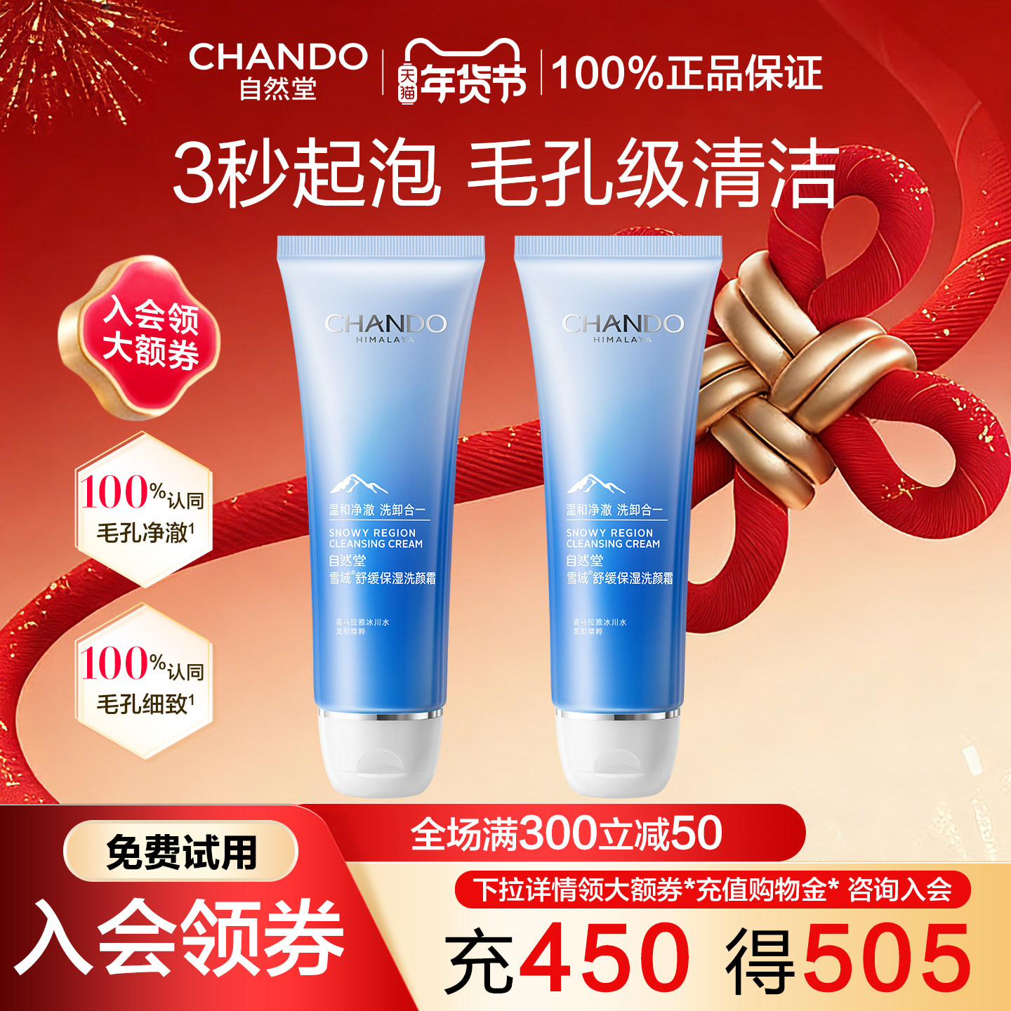 自然堂洗面奶旗舰店官方正品雪域氨基酸泡沫温和清洁毛孔女洁面乳