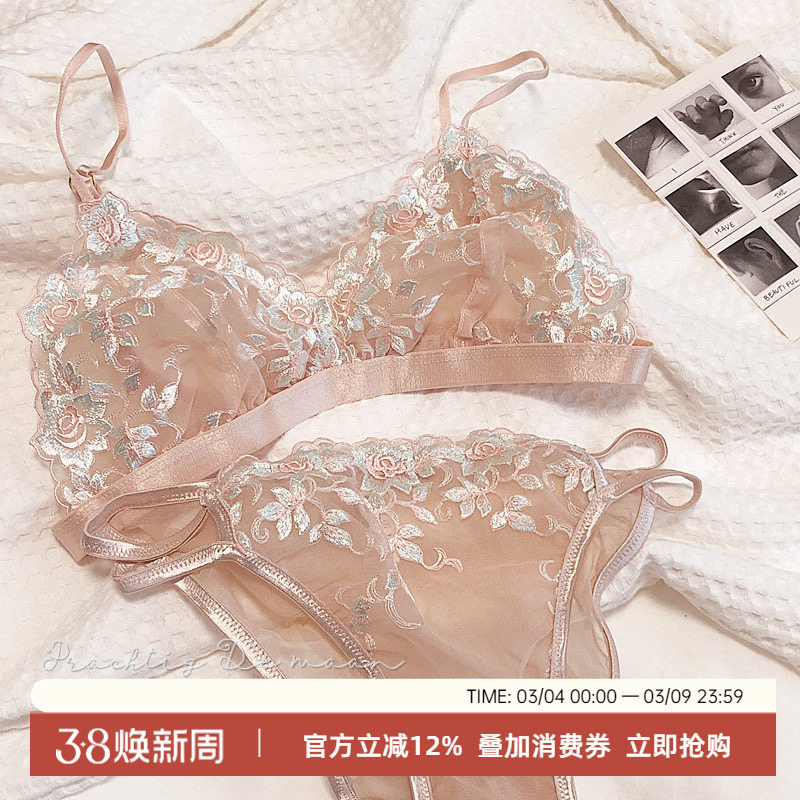 法式刺绣蕾丝梦幻三角杯无钢圈细带小胸内衣套装超薄性感文胸奶罩