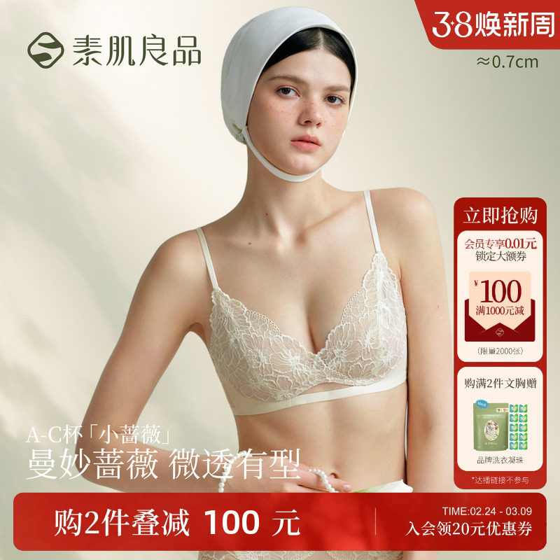 素肌良品小蔷薇无钢圈薄款透气内衣女蕾丝套装性感小胸聚拢文胸罩