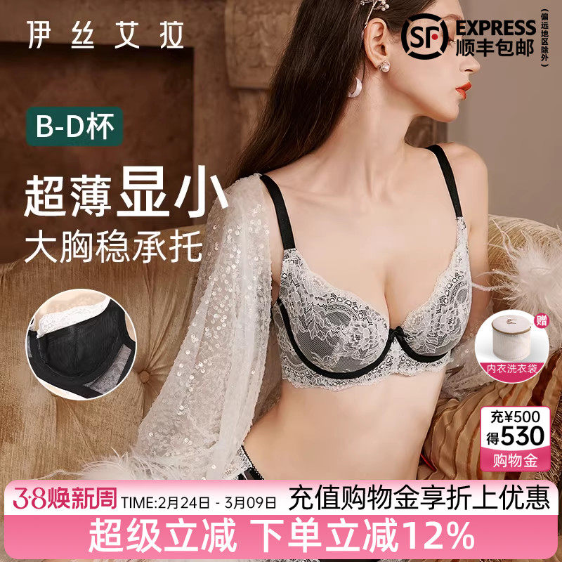 伊丝艾拉大胸显小胸内衣套装女士薄款性感蕾丝聚拢防下垂黑色文胸