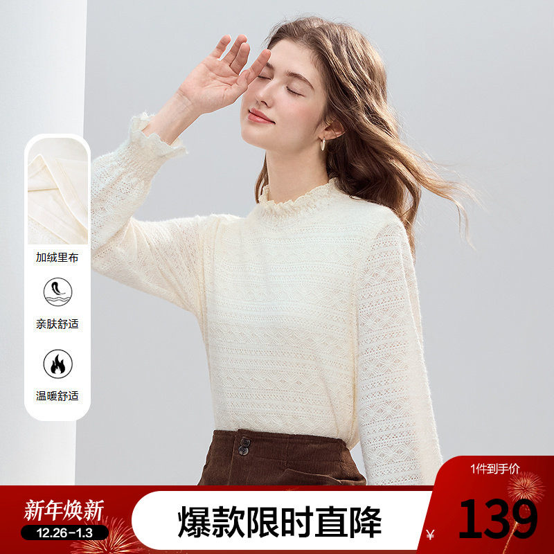 betu百图法式木耳边加绒衬衫女2025年冬季新款半高领衬衣打底衫