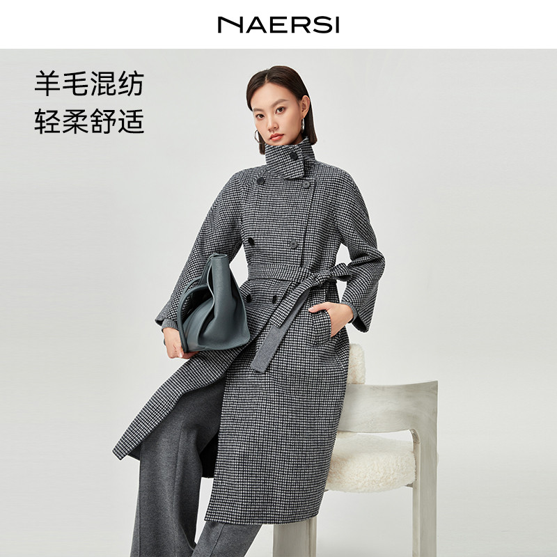 NAERSI娜尔思绵羊毛千鸟格大衣25年冬季新款中长款毛呢外套