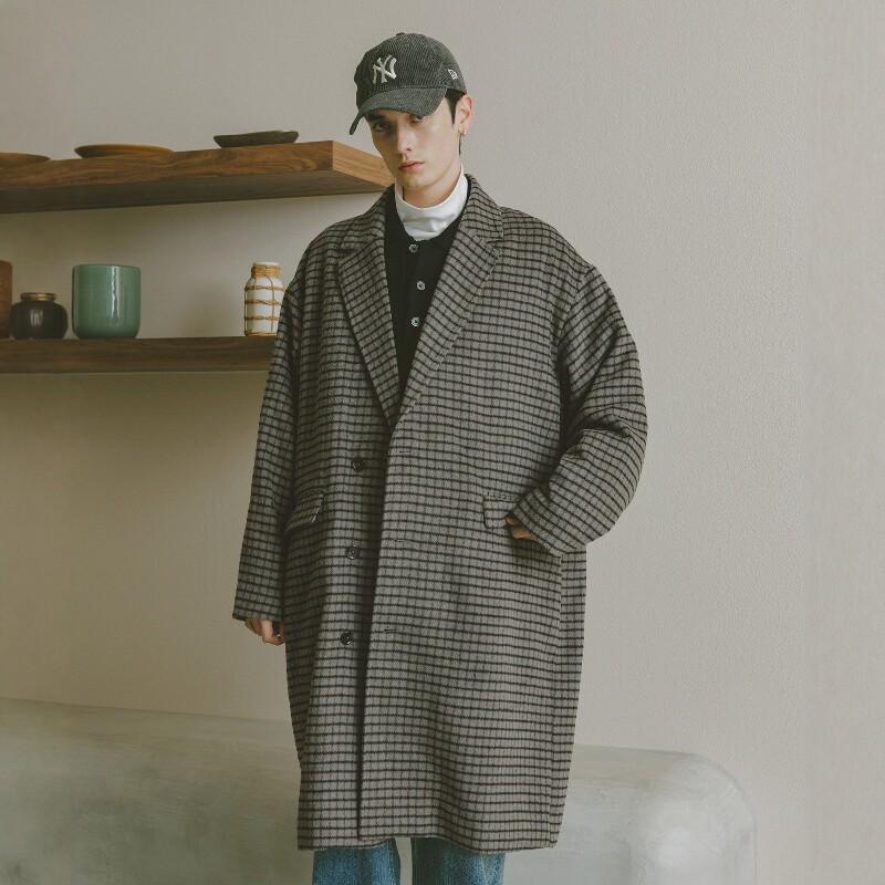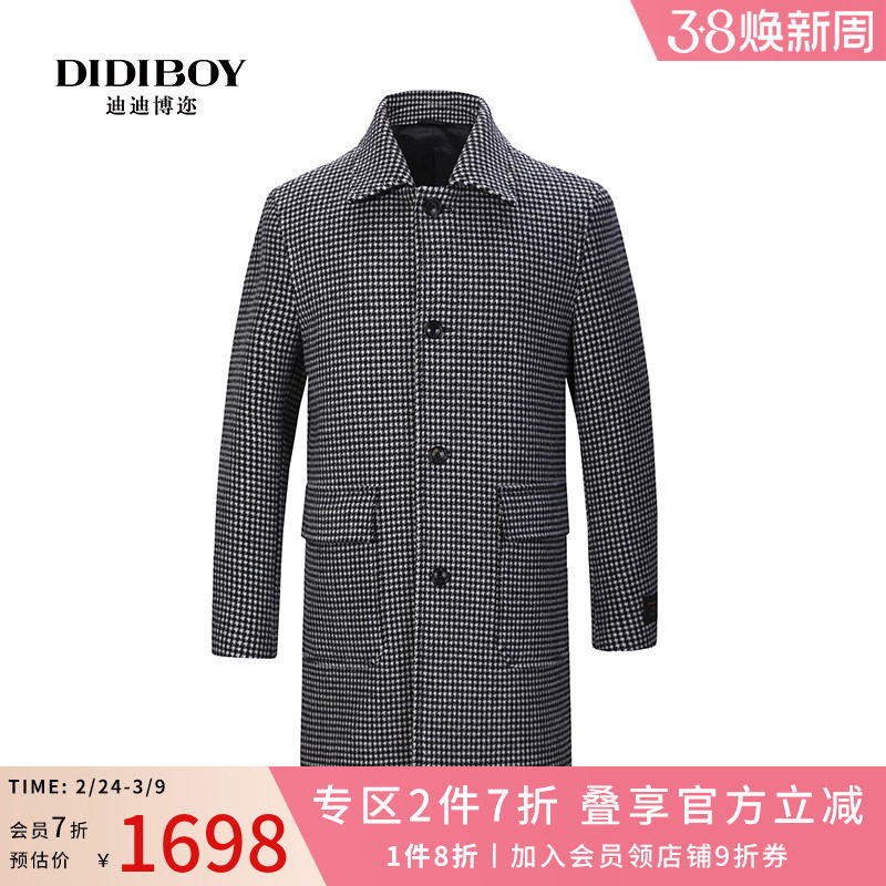 DIDIBOY迪迪博迩秋冬季男士千鸟格大衣中长款羊毛呢大衣翻领外套