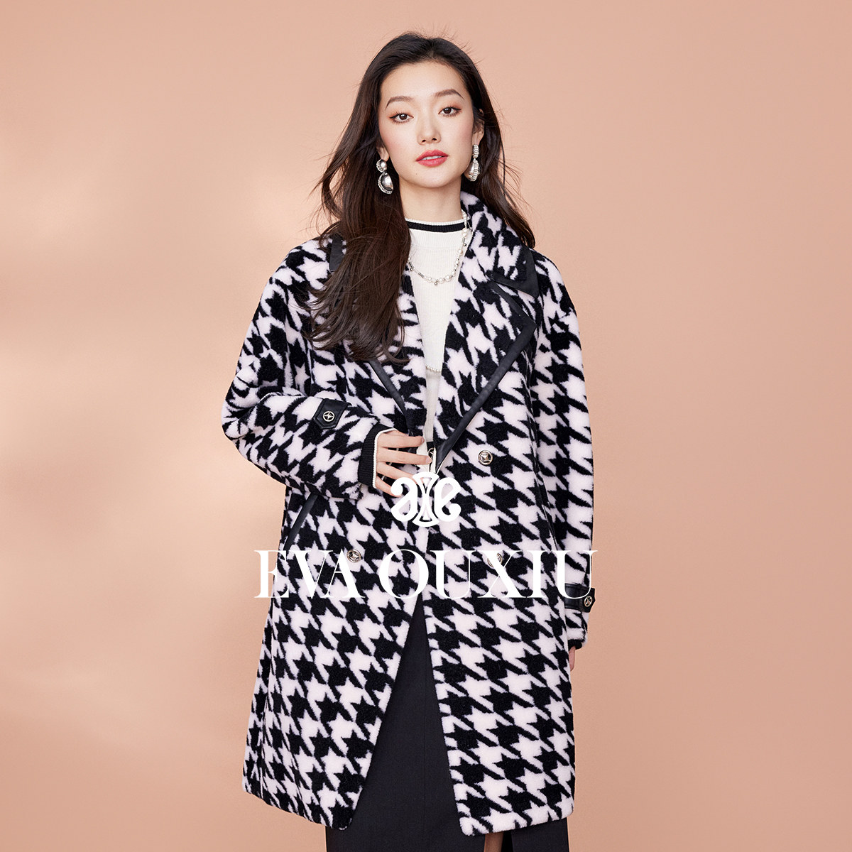 【限时直降】伊华欧秀羊毛千鸟格大衣外套女冬季新皮草E35CS0940