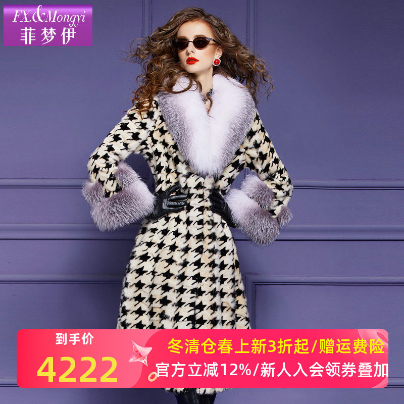 菲梦伊水貂毛皮草外套女冬季新款狐狸毛领加厚保暖高级千鸟格大衣