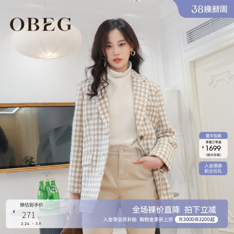 OBEG欧碧倩千鸟格羊毛西装外套秋冬款韩版廓形大衣女10404105