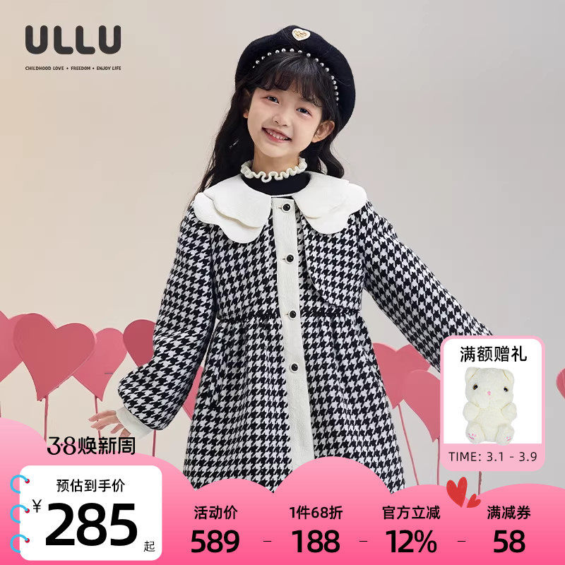 ULLU优露童装女童中长大衣24冬款双层花瓣翻领复古千鸟格大衣外套