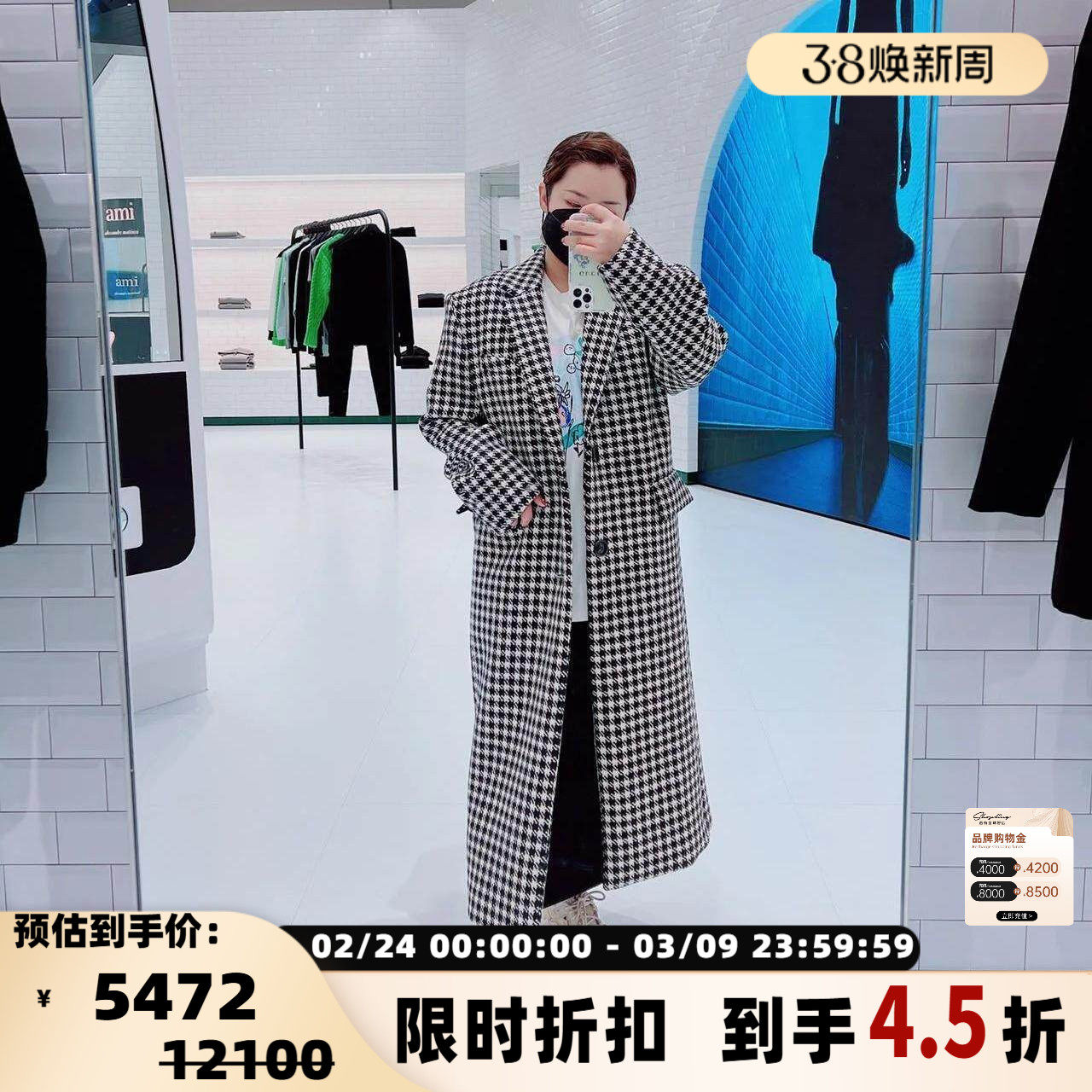 Ami Paris 秋冬款女士羊毛千鸟格大衣外套银泰百货精品 301596