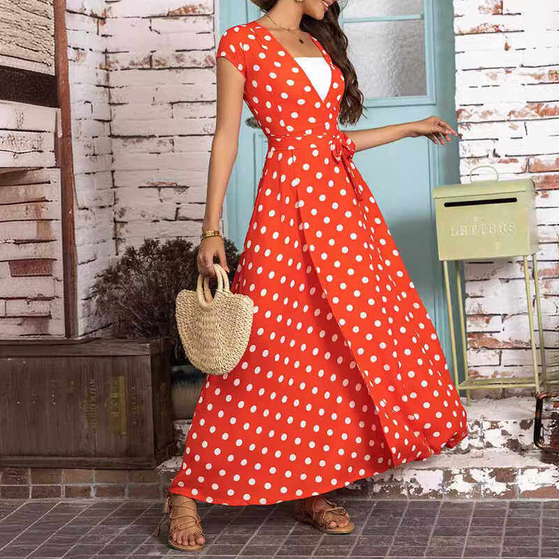 波西米亚复古度假短袖长款连衣裙修身显瘦雪纺长裙沙滩波点裙子女