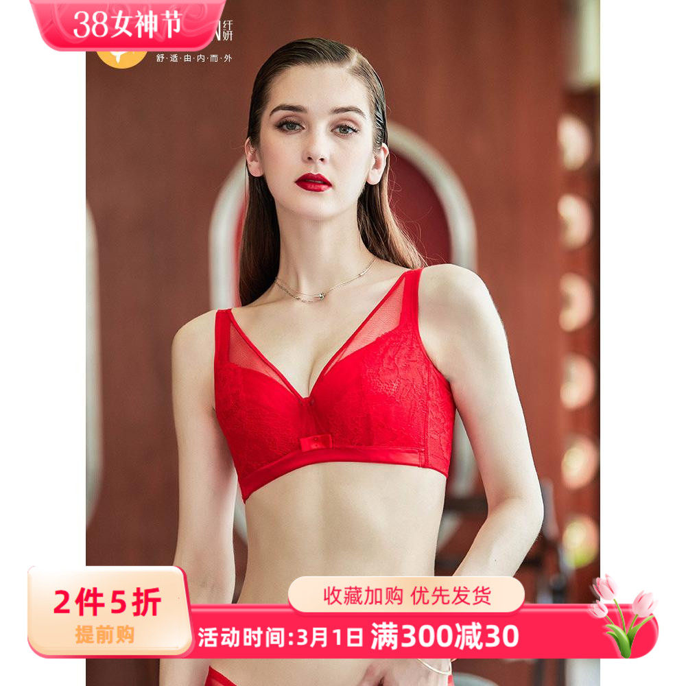 内衣女无钢圈大胸文胸罩大码胖mm小胸聚拢上托调整收副乳红色套装