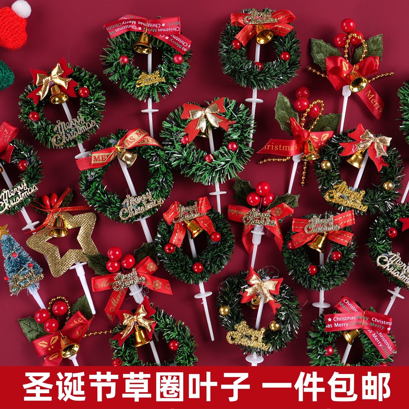 2026圣诞节蛋糕装饰摆件圣诞草圈叶子铃铛圣诞树插件甜品装扮插件
