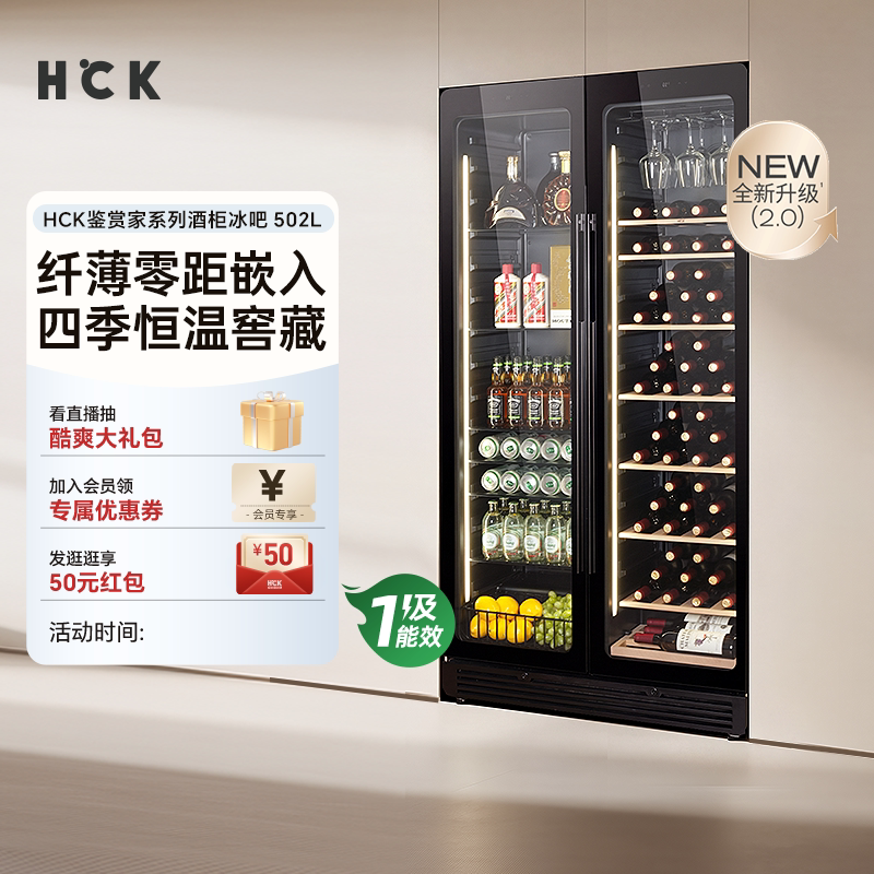 HCK哈士奇高端红酒柜恒温客厅家用冰吧嵌入式超薄双门双温展示柜