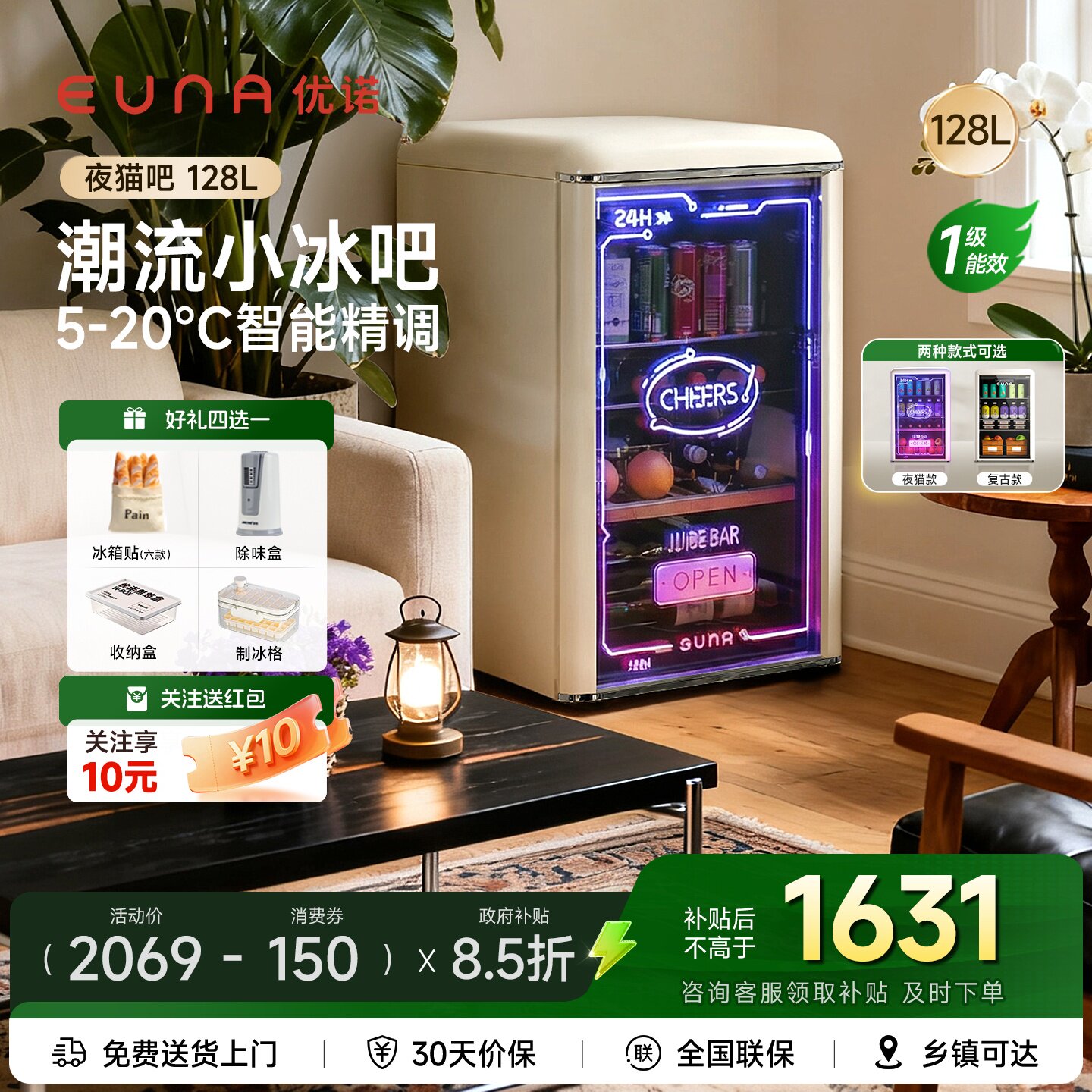 EUNA优诺128L冰吧夜猫吧电竞房冷藏饮料柜家用保鲜茶复古小冰箱