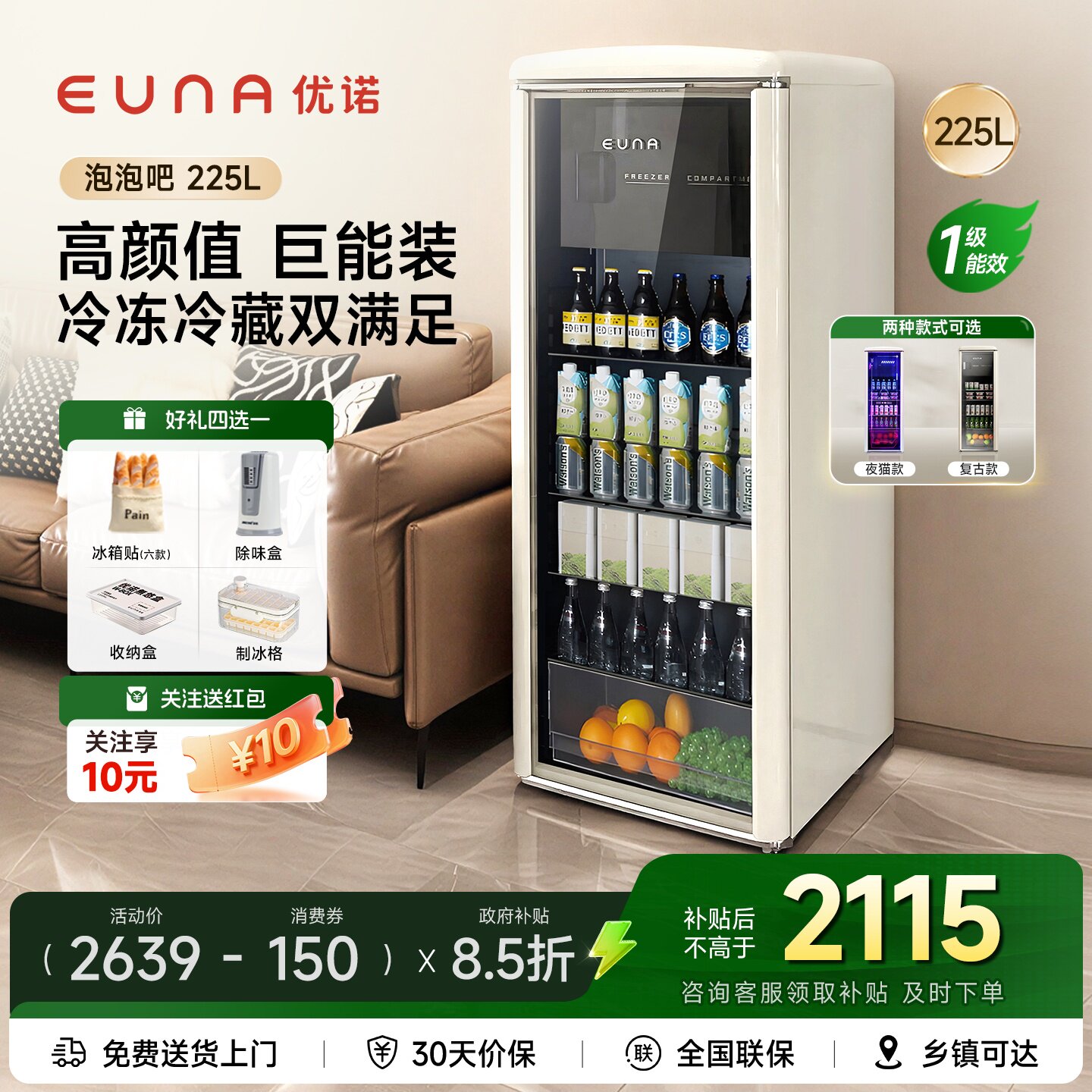 EUNA优诺冰吧泡泡吧225升家用冷冻冷藏柜饮料酒柜高端办公室冰箱