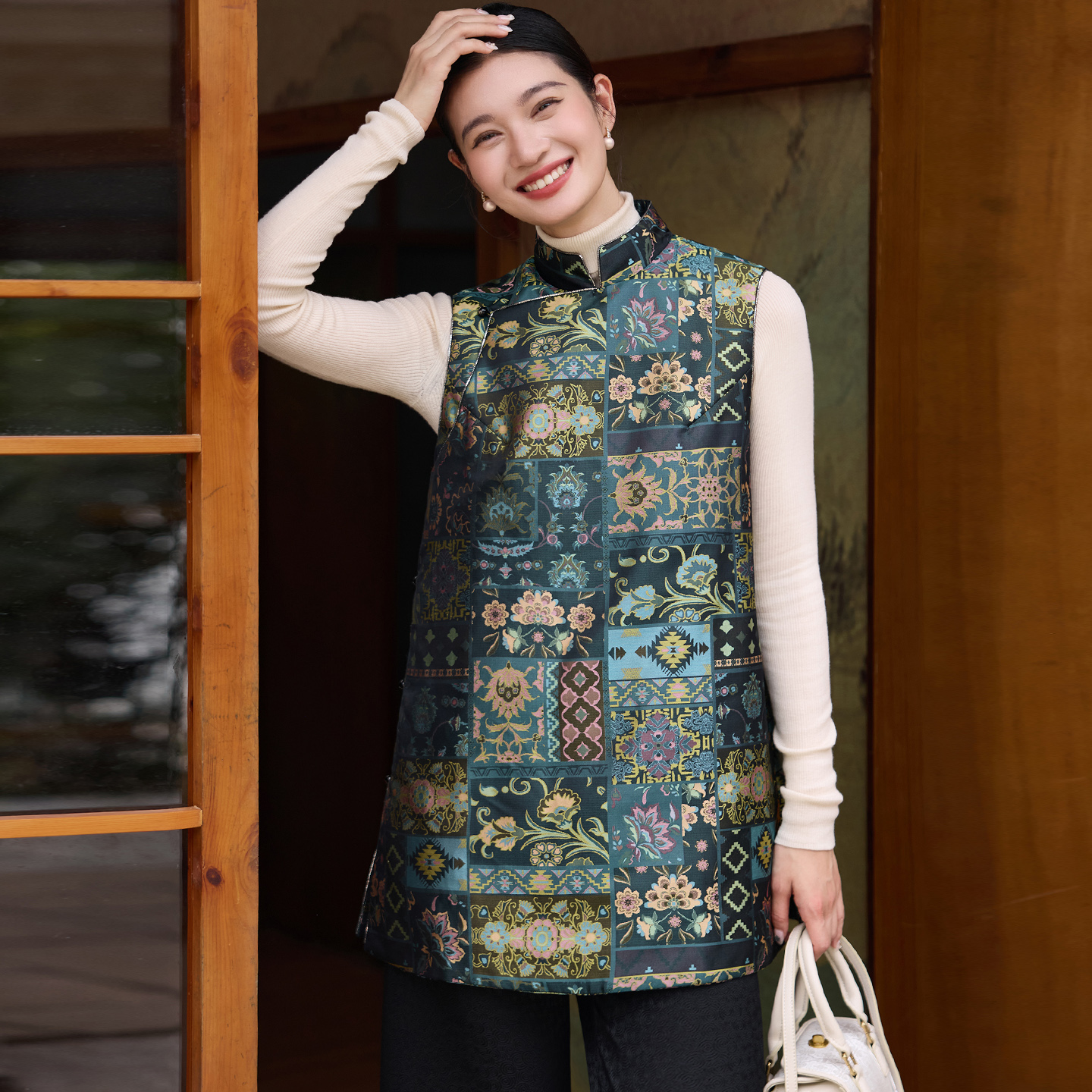 三马家~真丝桑蚕丝宋锦中长款马甲V领新中式国风女背心外穿上衣