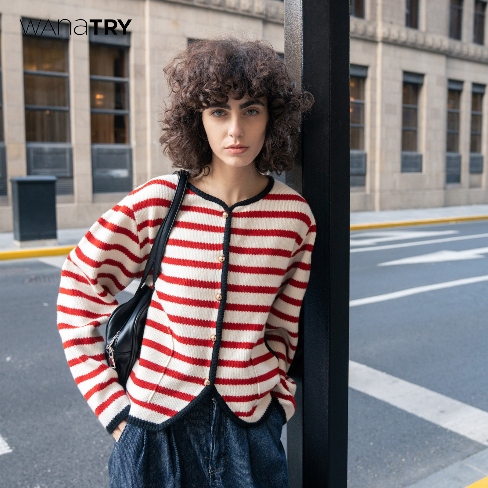wana try【明星同款】复古红条纹法式纯羊毛开衫系扣毛衣上衣女
